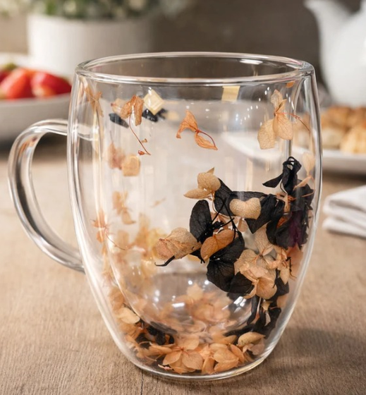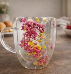 Taza de vidrio de doble pared con flor seca decorativa. Capacidad de 300 ml. Presentación en caja blanca. Disponible en dos colores. Ideal para infusiones y bebidas calientes.