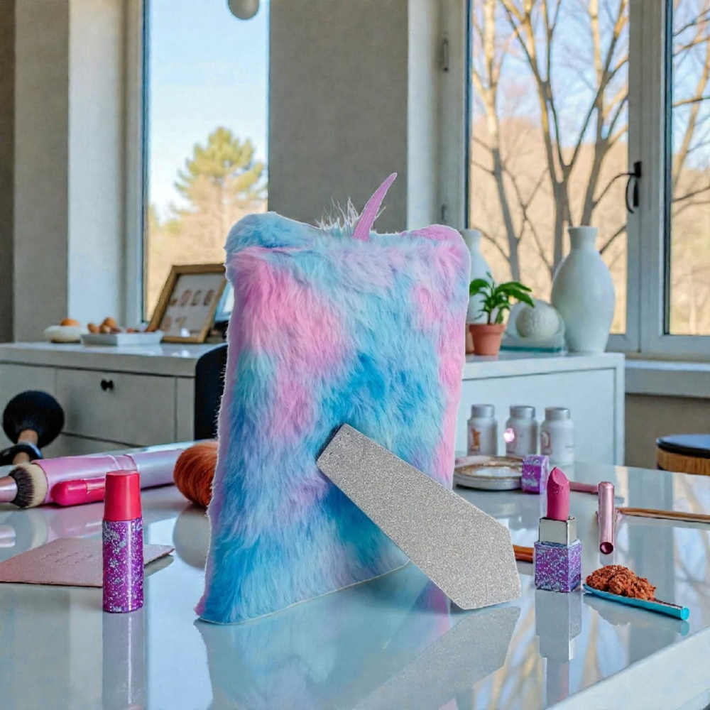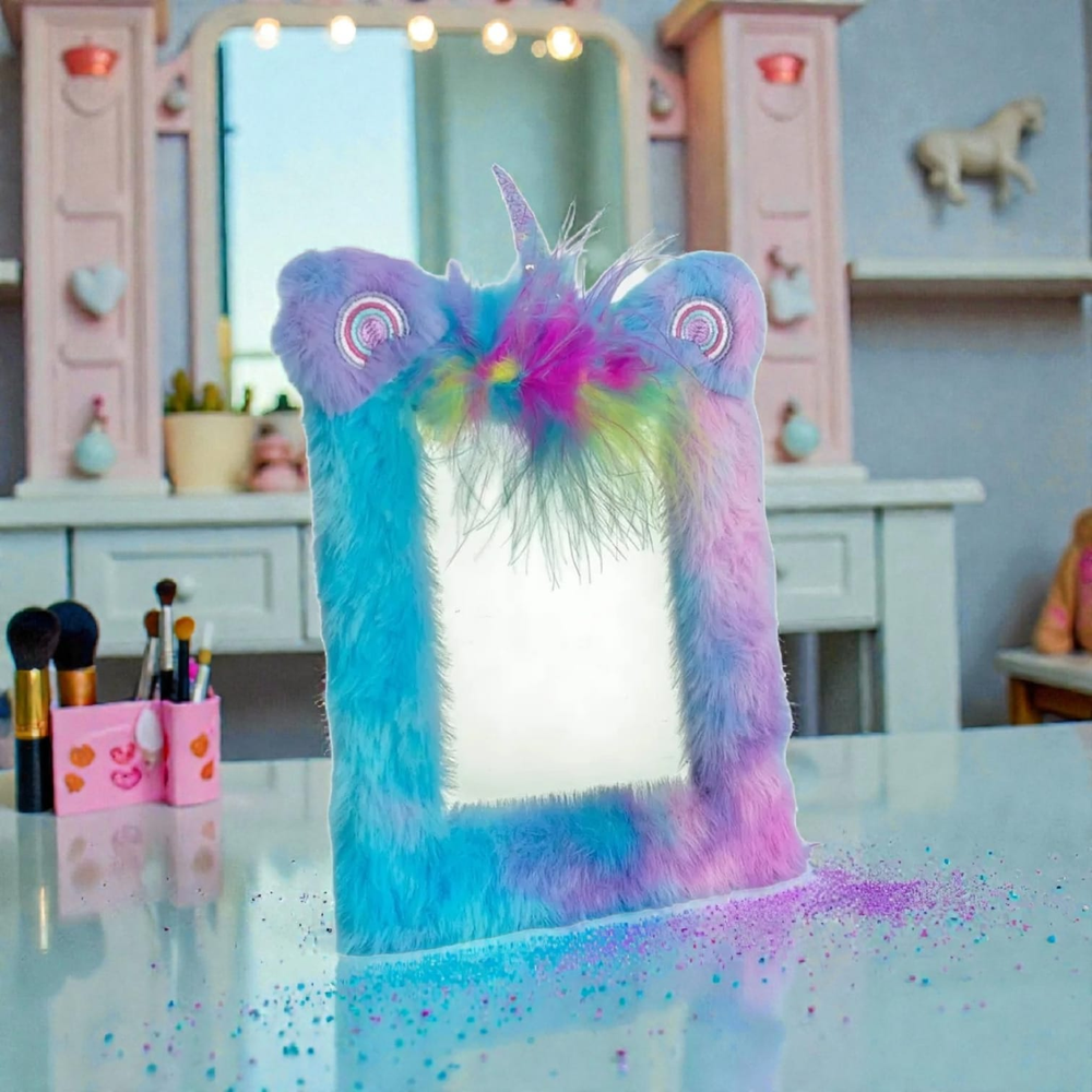 Espejo de mesa con marco peludito y orejas de animal, ideal para decorar tu escritorio o tocador. perfecto para maquillarse o simplemente añadir un toque divertido a tu espacio.