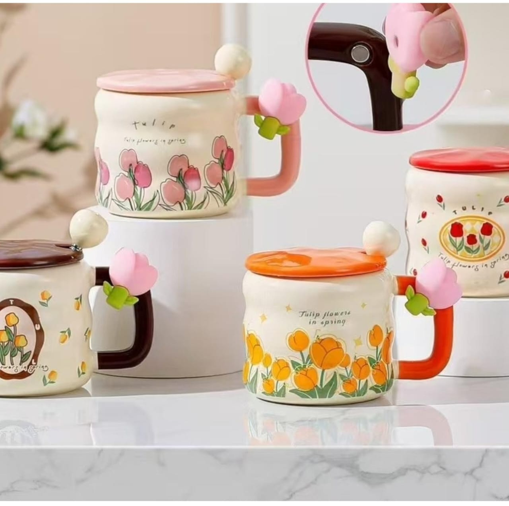 TAZA CERAMICA FLORAL CON TAPA + CUCHARITA