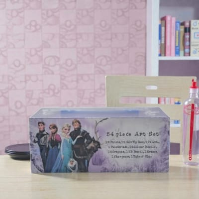 Se trata de un set de arte de FROOZEN Es un kit diseñado para inspirar la creatividad de los niños con una variedad de materiales artísticos. • Incluye materiales como crayones, lápices de colores, marcadores, acuarelas y pasteles. • A menudo viene en un maletín portátil con un diseño temático del personaje. • Ideal para proyectos escolares, actividades artísticas y regalos. • Fomenta la imaginación y la motricidad fina en los niños.