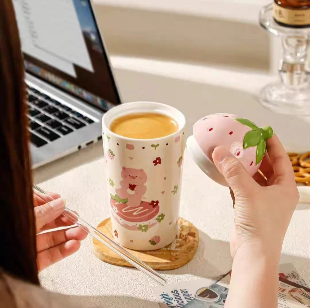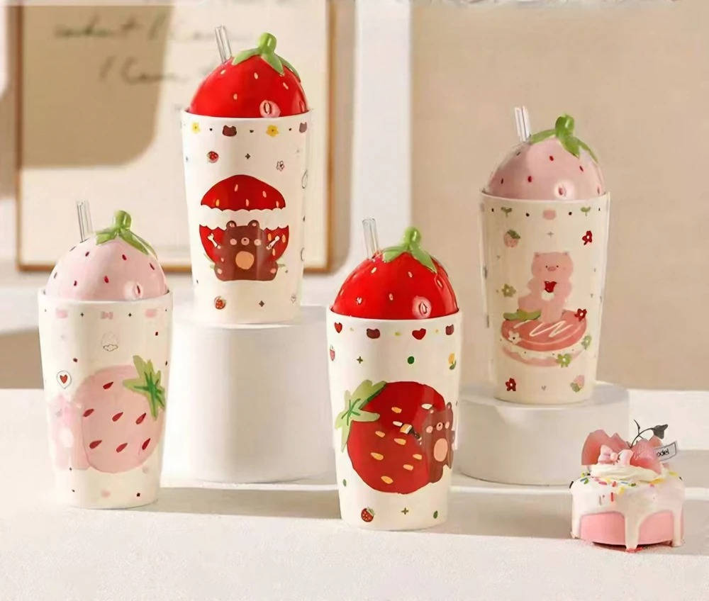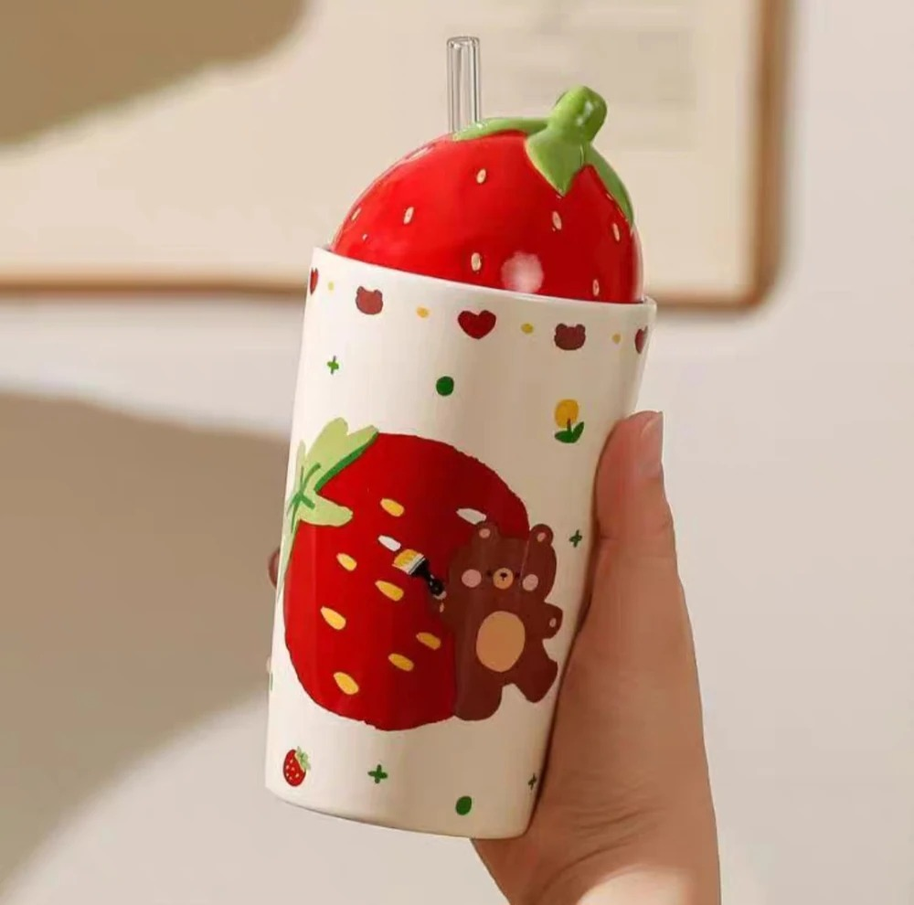 VASO CERAMICA CON TAPA Y SORBETE DE VIDRIO FRUTILLA