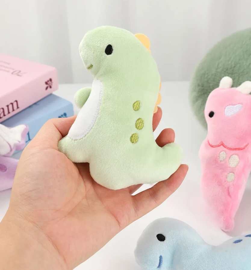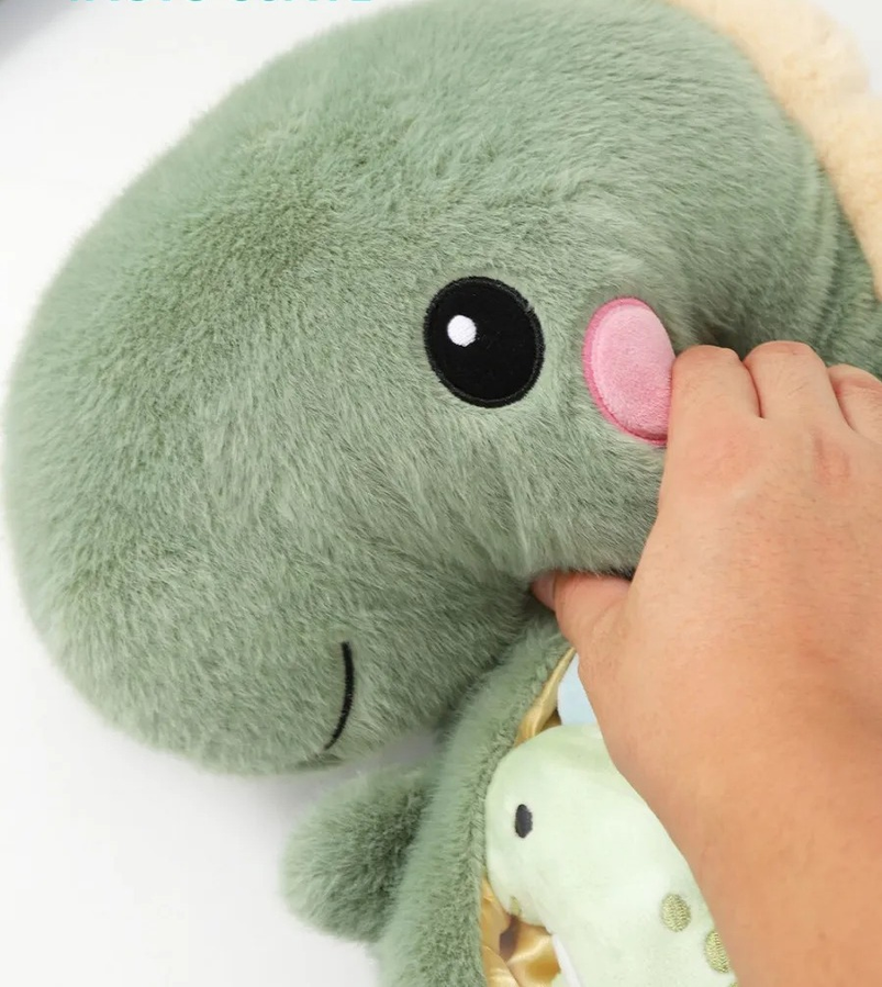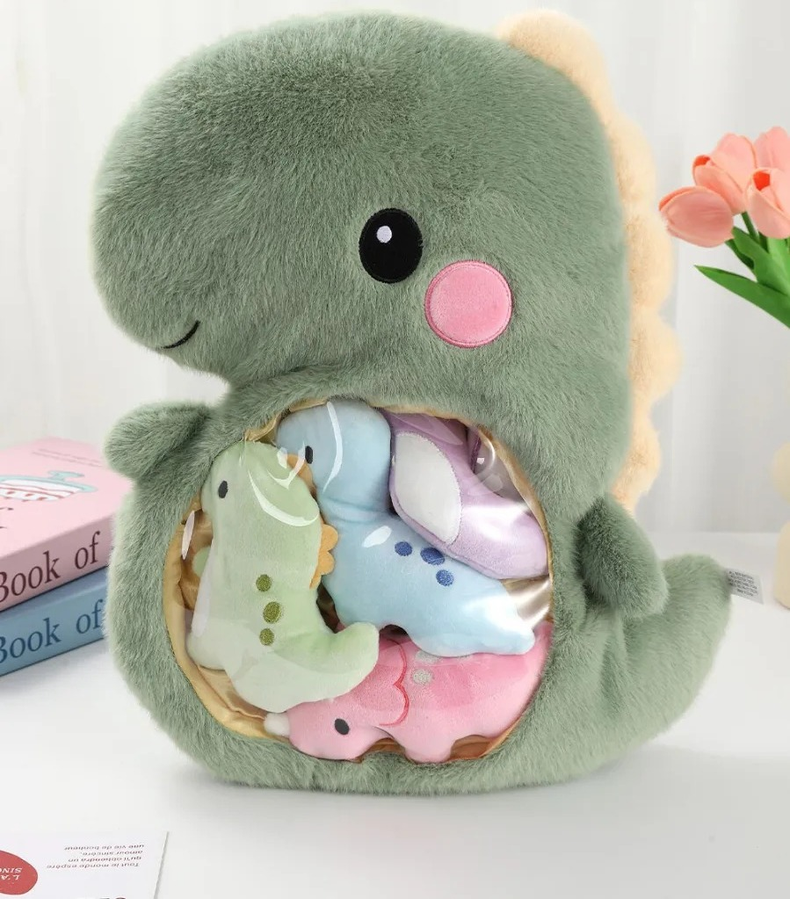 Peluche con forma de dinosaurio que combina ternura y funcionalidad. Su diseño permite guardar pequeños objetos en su interior, ideal para escritorio, mochila o habitación infantil.