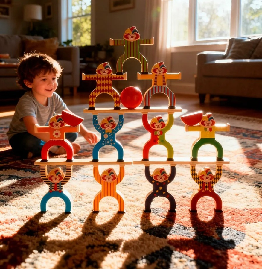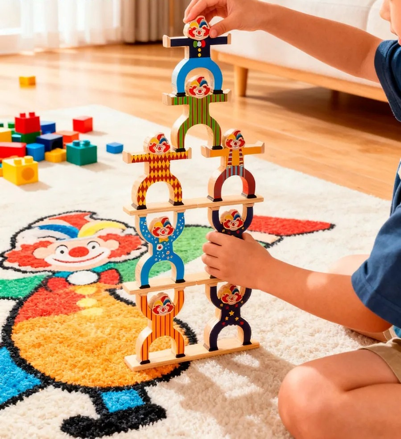Juego de bloques apilables con divertidos personajes de payaso, ideal para que los niños se diviertan mientras desarrollan habilidades de equilibrio y coordinación. Las piezas permiten crear diferentes estructuras, estimulando la imaginación y el pensamiento lógico a través del juego.