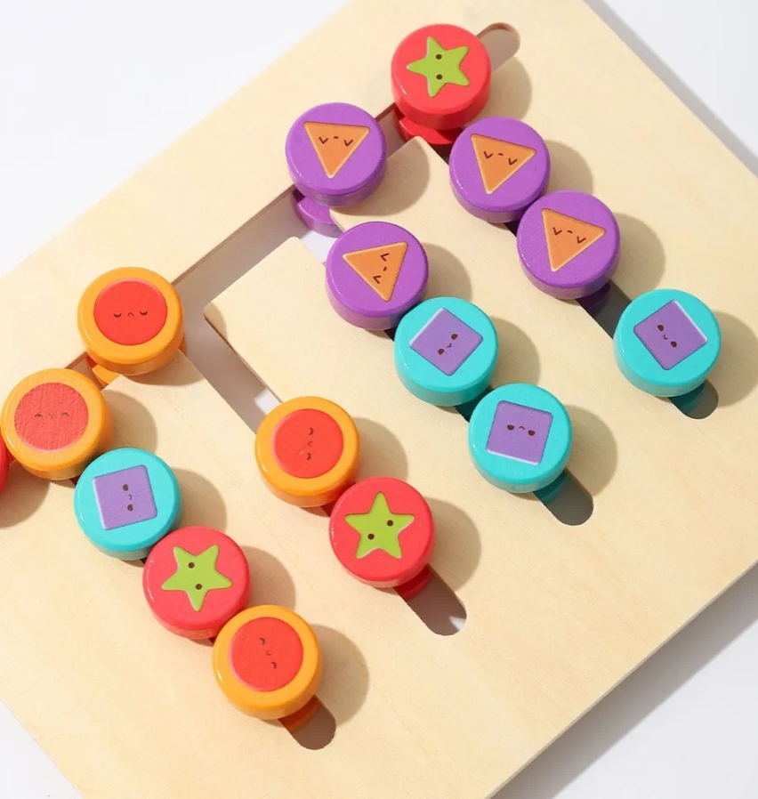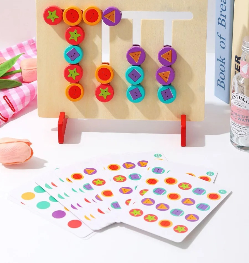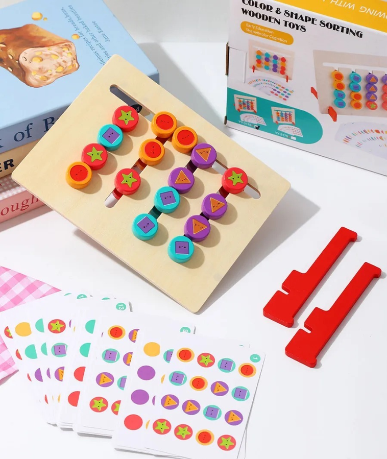Juego educativo de madera diseñado para estimular el pensamiento lógico y la concentración y clasificación por colores y formas. Los niños pueden seguir las tarjetas temáticas y ordenar las piezas según el color. Ideal para jugar de forma individual o en familia, promoviendo la interacción y el aprendizaje compartido.