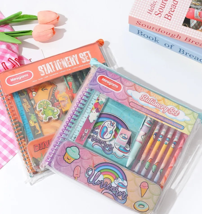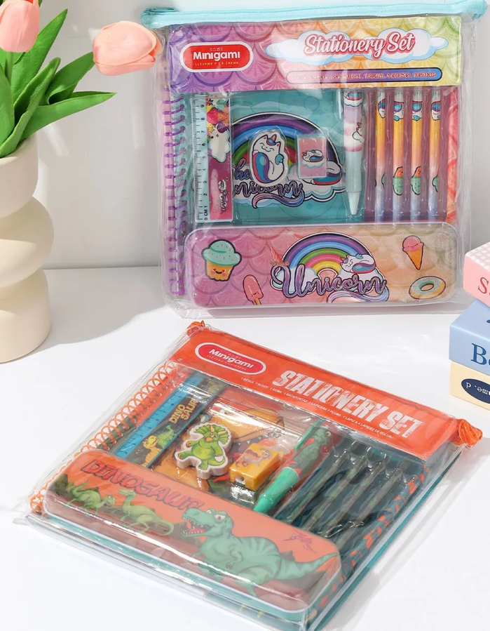 Set de librería con diseño colorido y práctico, ideal para uso diario en estudio o escuela. Todos los artículos vienen incluidos en un solo set, listo para usar y fácil de llevar.