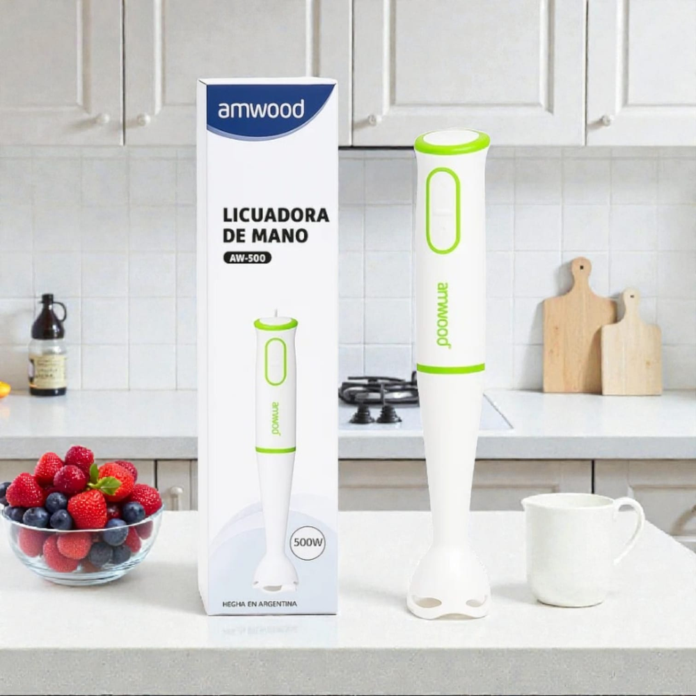 El Minipimer AMWOOD Verde Motor de 300W y con 2 velocidades para adaptarse a distintas preparaciones. Su diseño incluye una cuchilla de acero inoxidable y un brazo extraíble que facilita la limpieza y el manejo, proporcionando eficiencia y durabilidad en la cocina.