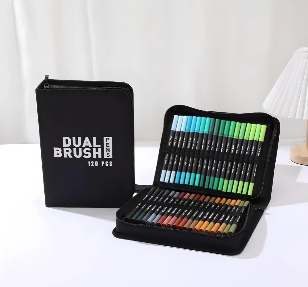 (Marcadores Dual Brush x 120 piezas. Contienen marcadores con doble punta, una es microfibra la otra es punta pincel indeleble ; Incluye estuche organizador práctico, ligero y liviano y una amplia gama de colores que no se repiten).