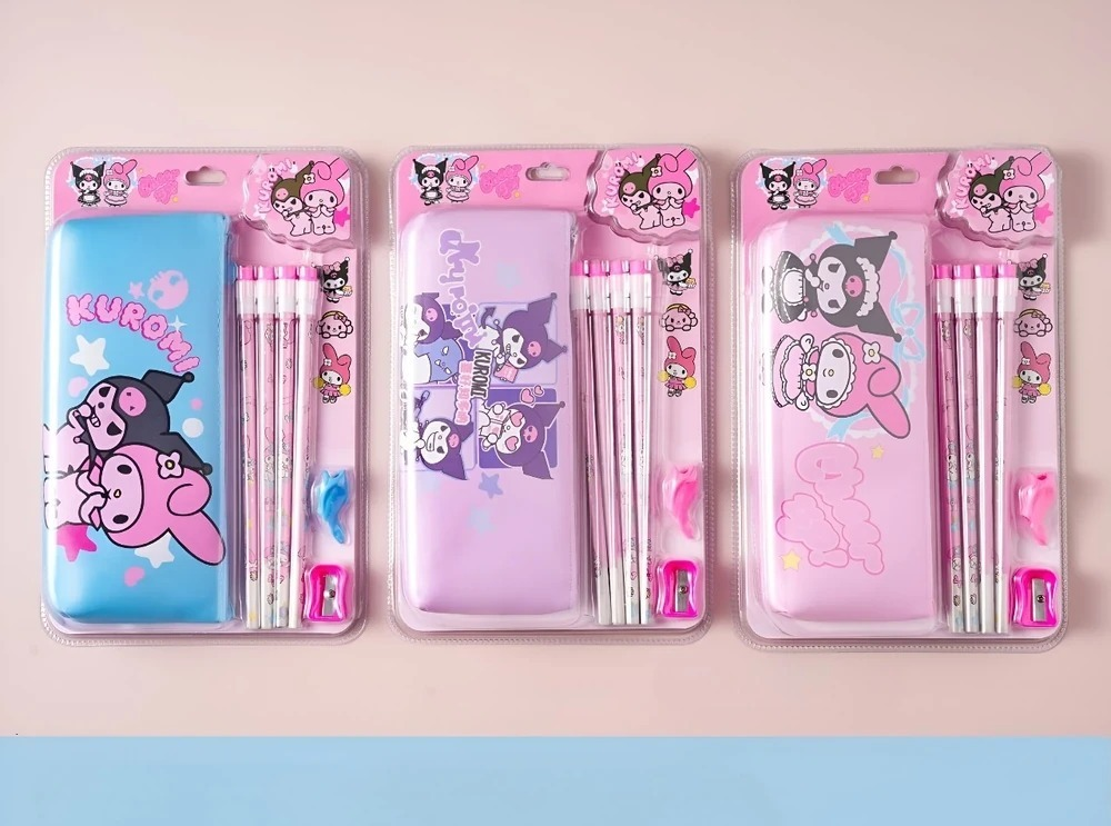 Set de útiles con temática de personajes "Sanrio". Cada set cuenta con cuatro lápices, una cartuchera y un sacapuntas. Ideal para uso escolar y regalar.