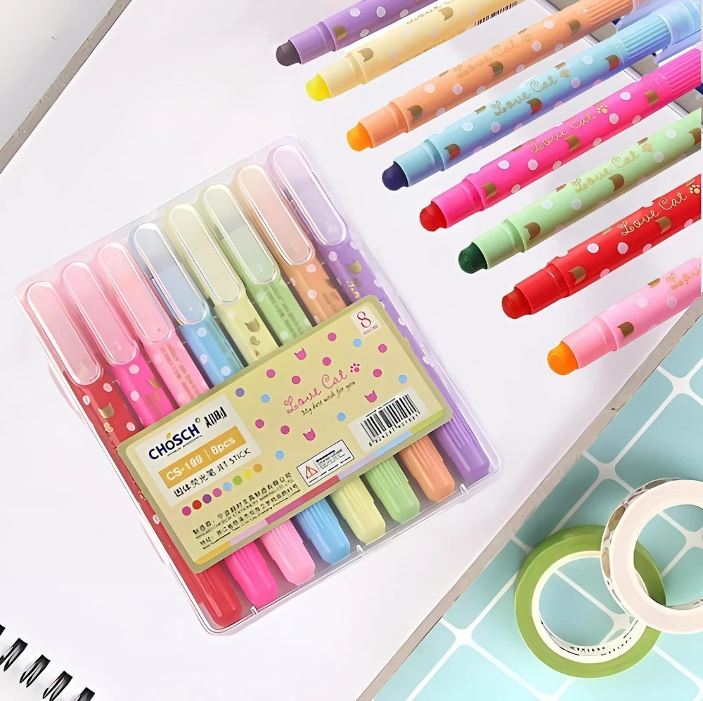 (Resaltadores tipo crayón. Utilizan una fórmula de cera que proporciona colores vibrantes y opacos. No traspasan el papel, lo que los hace ideales para libros, biblias y documentos delicados).