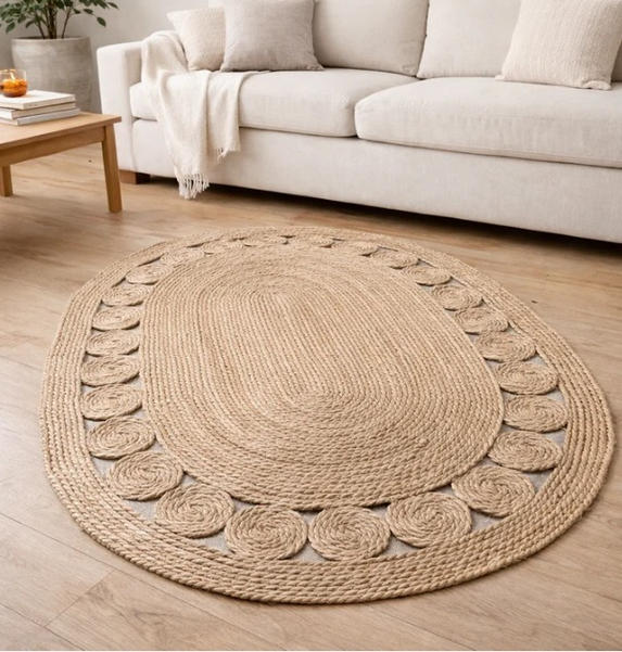 Alfombra Oval de fibra natural. Ideal para living, dormitorio o espacios decorativos. Medida: 120x80 cm. Terminación con borde tejido para mayor durabilidad.