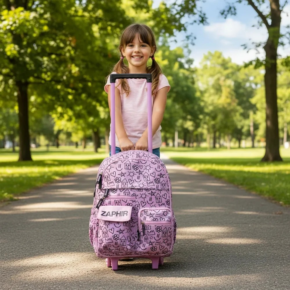Mochila de 17pulgadas de carrito estampada con apertura frontal para guardar los útiles que cuenta con cinco bolsillos frontales.