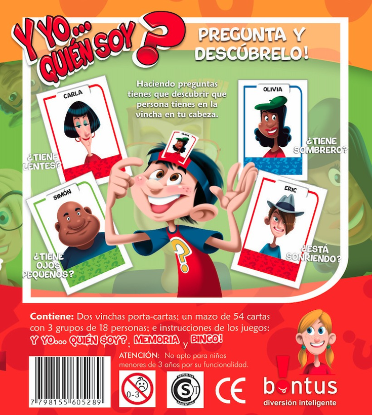 2 a 6 jugadores 6+ Contenido Dos vinchas porta-cartas, un mazo de 54 cartas con tres grupos de 18 personas e instrucciones de los juegos: "Y yo...quién soy?"; "Memoria" y "Bingo!"