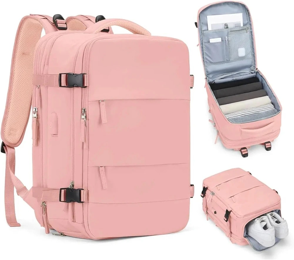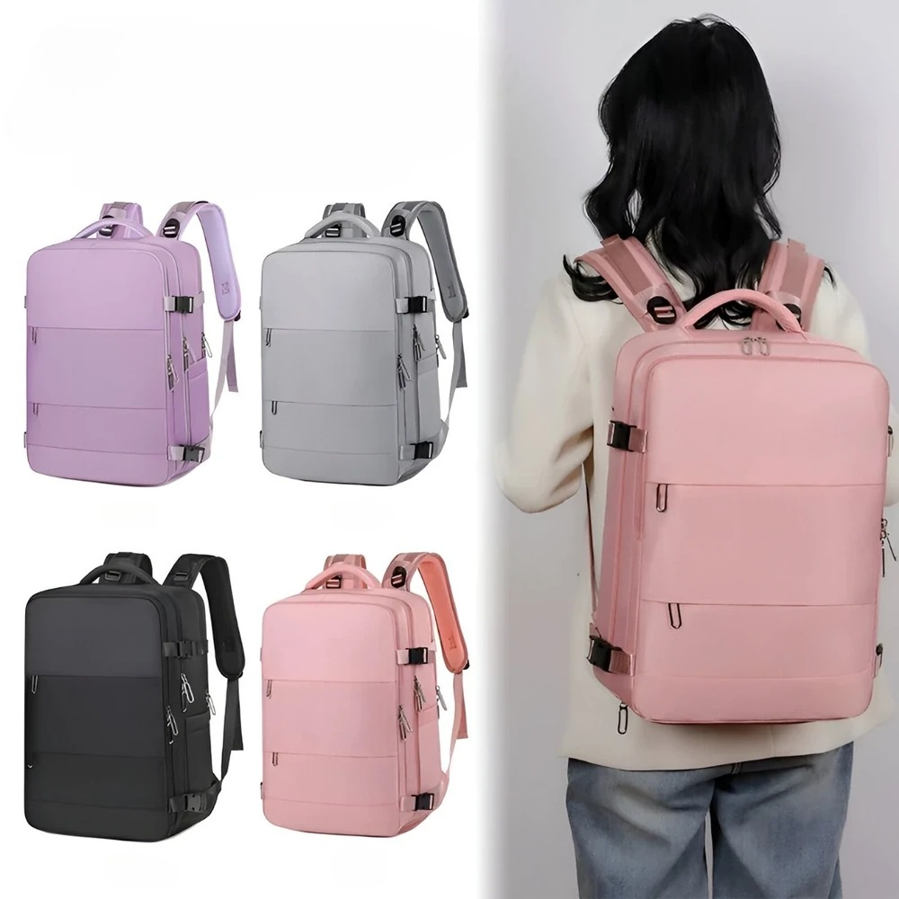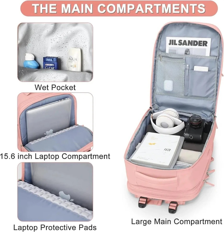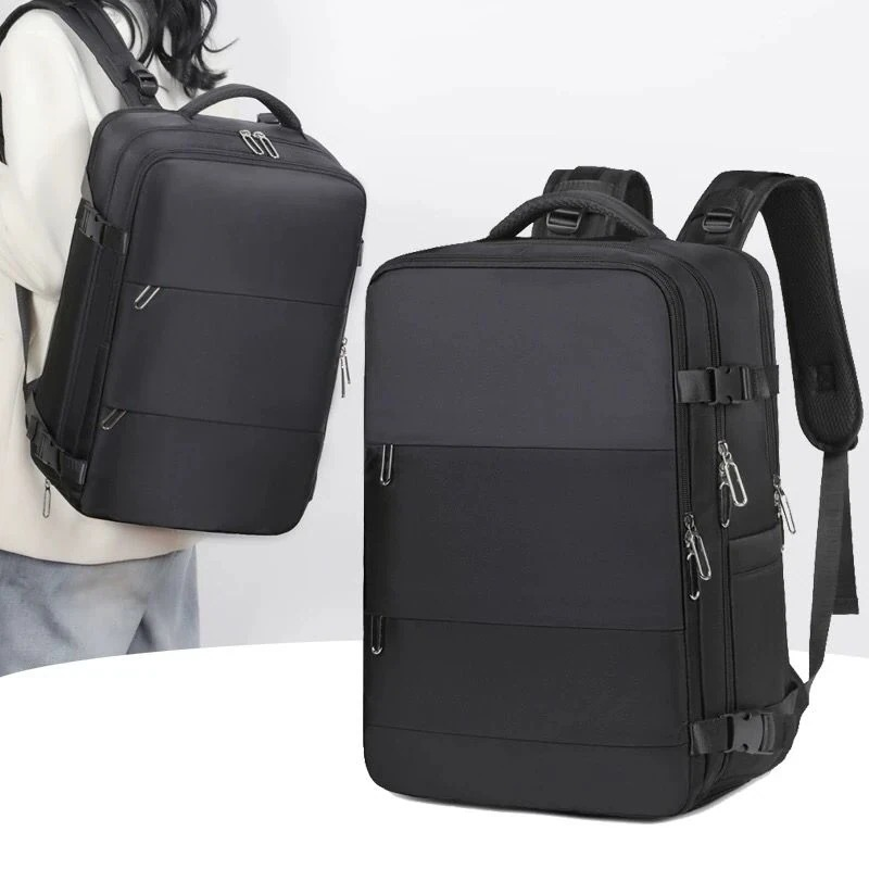 (Mochila de viaje unisex que cuenta con 3 compartimentos centrales y 1 copartimento extra para calzados, en su frente podemos encontrar 2 bolsillos ideale para guardar todos aquellos pequeños accesorios extras, su primer compartimento se encuentra diseñado especialmente para elementos húmedoss,, el segundo compartimento cuenta con 5 bolsillo internos, 2 de mayor tamaño, 2 mas chicos y uno chico de red con cierre, y su tercer compartimento es ideal para llevar su computador, ademas en su panel posterior exterior y el lado interno de las tiras cuenta con tela transpirable y un bolsillo antirrobo oculto, tambien en sus laterales cuenta con 4 correas ajustables, una agarradera de mano y una tira para sujetar en la valija).