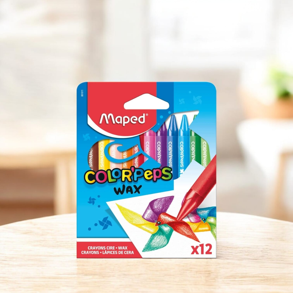 • Lápices de cera suaves con colores vivos • Cuerpo con funda protectora de papel que evita que se manchen las manos • Forma triangular para un mejor agarre Descubrilos! Son geniales, son Maped!