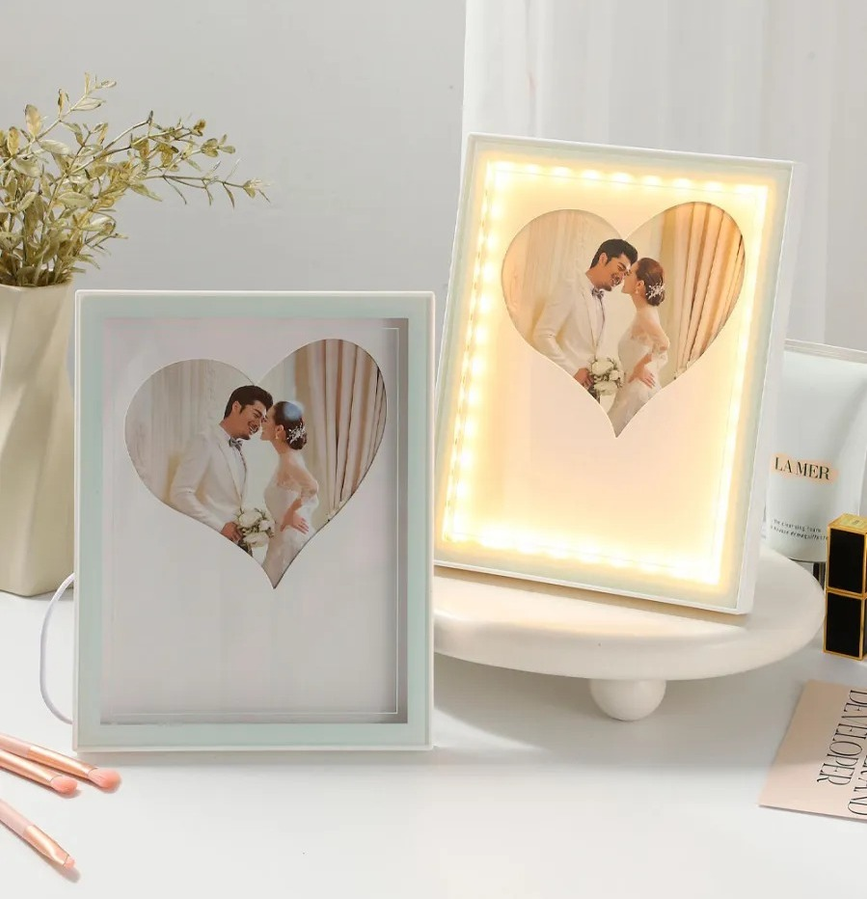 Marco de fotos con luz LED forma de corazón Guardá tus momentos más especiales con este marco de fotos iluminado con diseño de corazón. Su estructura combina vidrio frontal y marco de plástico resistente, destacando tus fotografías con una luz LED suave que crea un ambiente cálido y romántico. Funciona mediante conexión USB, ideal para decorar dormitorios, escritorios o regalar en ocasiones especiales. Disponible con luz cálida o luz blanca para adaptarse a tu estilo.