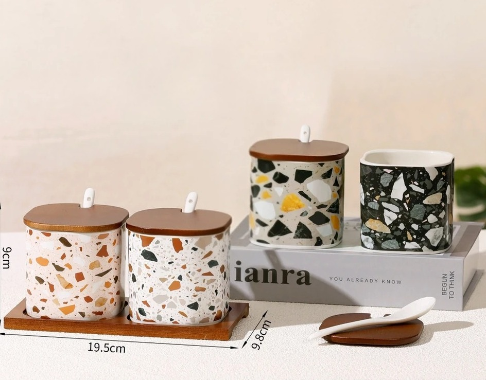 SET DE ESPECIEROS CERAMICA X 2 PIEDRA CON TAPA BAMBU