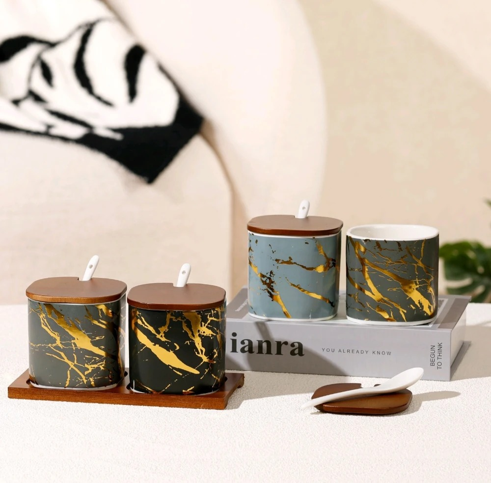 SET DE ESPECIEROS CERAMICA X 2 MARMOL CON TAPA BAMBU