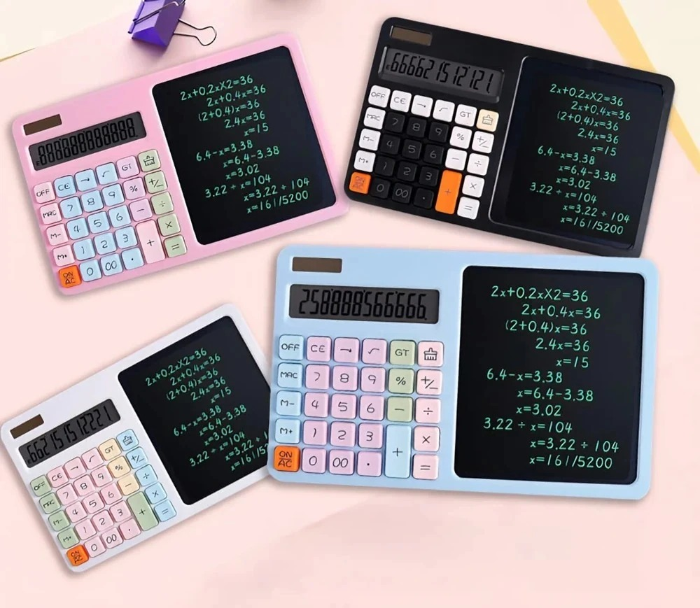 Calculadora 12 digitos con pizarra y lapiz. Botón de borrado rápido y switch de bloqueo de pantalla Incluye 2 lápices ópticos. Funciona con 2 pilas AAA y energía solar Medidas: 26 cm de largo x 14.5 cm de ancho Disponible en 4 colores