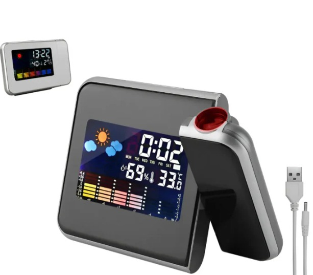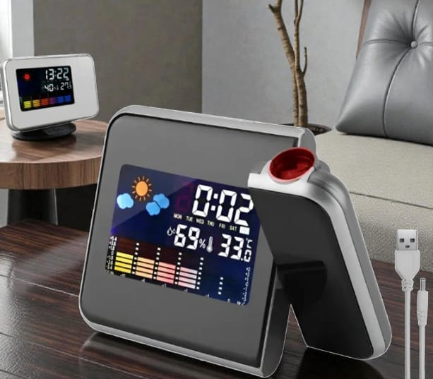 Proyector Movil (hacia adelante y atrás) 180° que proyecta la hora en cualquier superficie durante 10 segundos al presionar el botón SNOOZE / LIGHT. Alarma / Despertador con Sonido en aumento. Formato de Hora Ajustable 12/24 hs con botón UP presionando unos segundos. Formato de Temperatura °C / °F ajustable con botón DOWN. Forma del Reloj: Rectangular. Medidas: 15cm (ancho) x 11cm (alto) x 2.7cm (profundidad - 7cm prof total). Alimentación: 2 Pilas AAA (NO Incluídas).