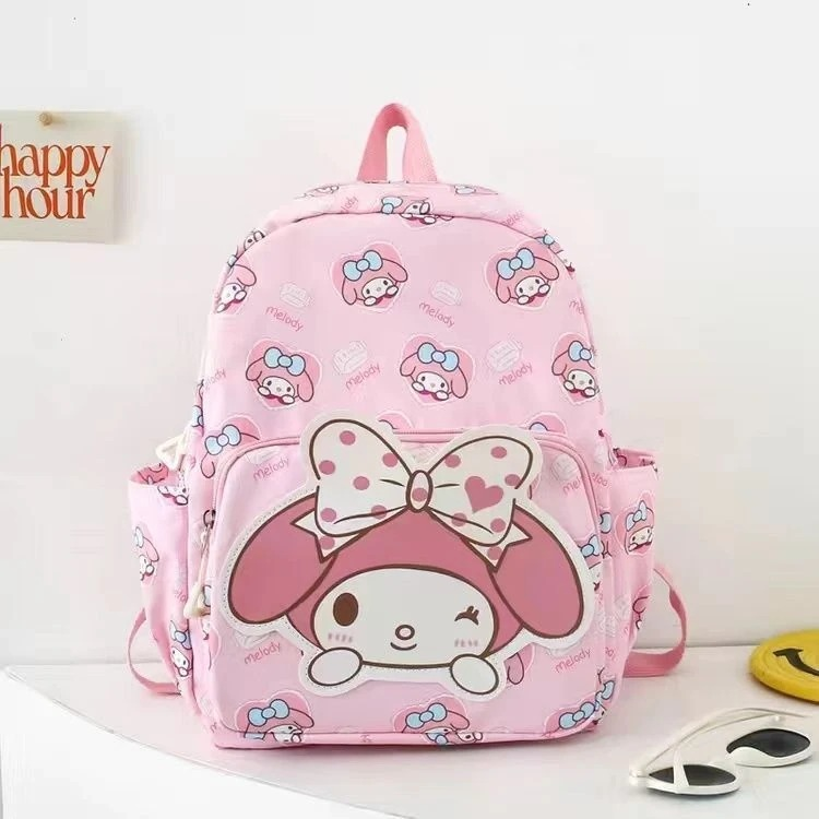 Cuenta con un compartimento principal, un compartimento frontal, dos bolsillos laterales, tiras ajustables y un diseño super bonito de personajes de "Sanrio". Ideal para uso escolar.