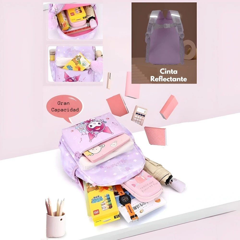 Cuenta con un compartimento principal, un compartimento frontal, 2 bolsillos laterales, tiras acolchadas ajustables con cinta reflectante . Ideal para uso escolar.