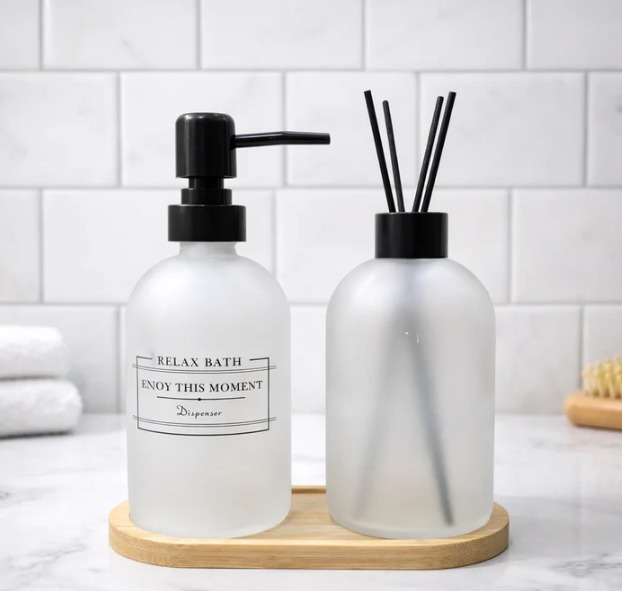 Set de Dispenser de jabon vidrio con dosificador de plastico + botella difusora de aroma de Vidrio. Incluye platode madera.