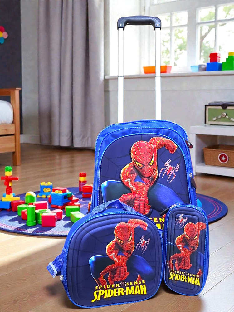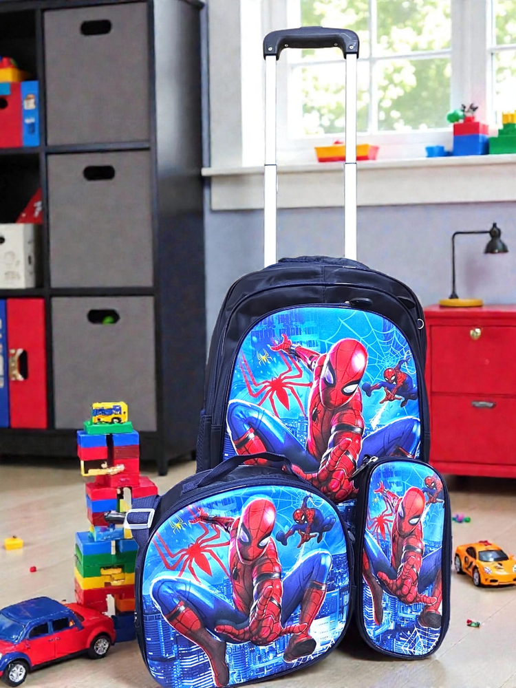 SET MOCHILA 3 CIERRES 4 PIEZAS HOMBRE ARAÑA (mochila+carrito+lunchera+cartuchera)