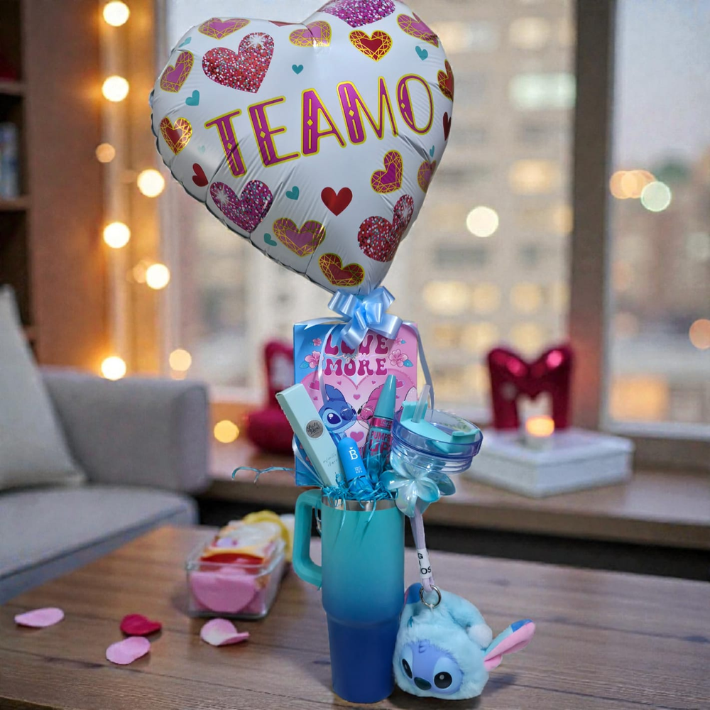 1 Jarro de acero térmico de 900ml 1 Llavero Stich Correa Portacelular 1 Broche flor para el cabello 1 Petaca doble Sonbras Stich 1 Máscara de pestañas 1 Alternativa olfativa perfume 30ml árabe para cartera 1 Labial en barra 1 Globo de 45cm corazón