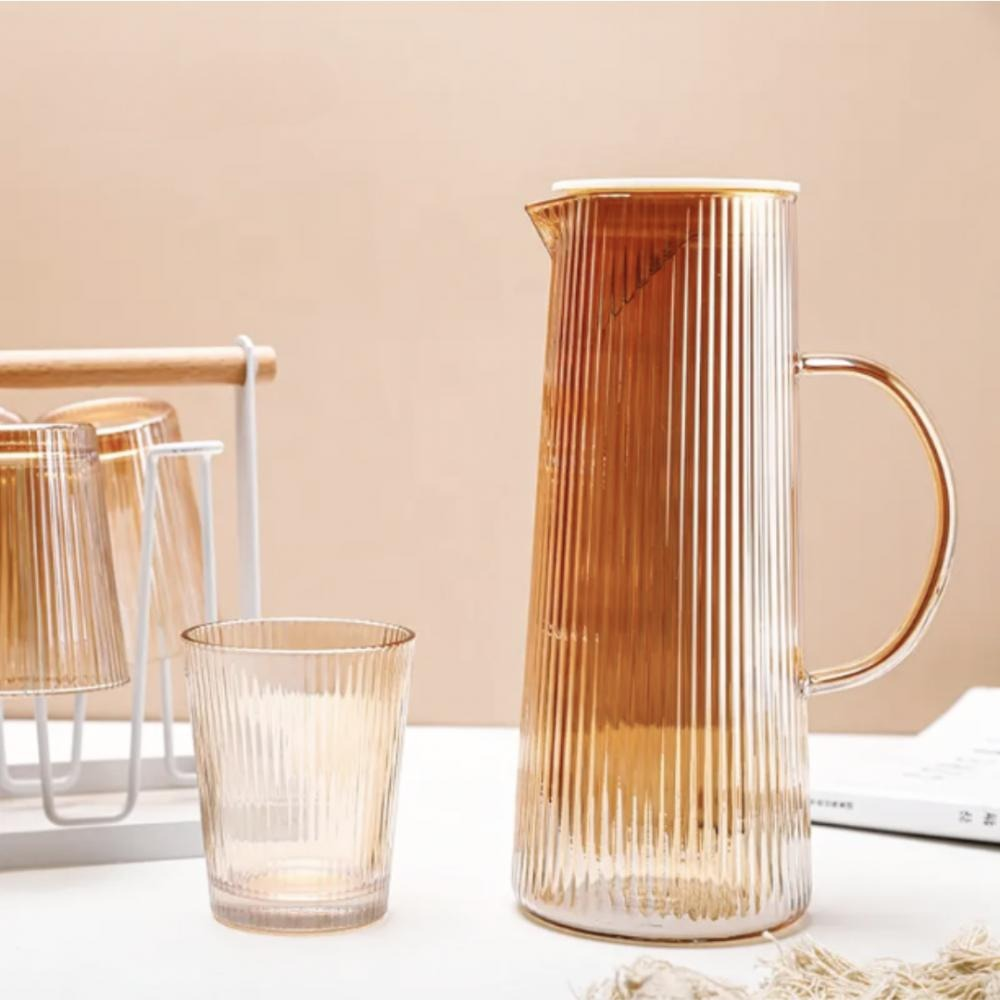 JARRA RAYADA CON 6 VASOS GOLD