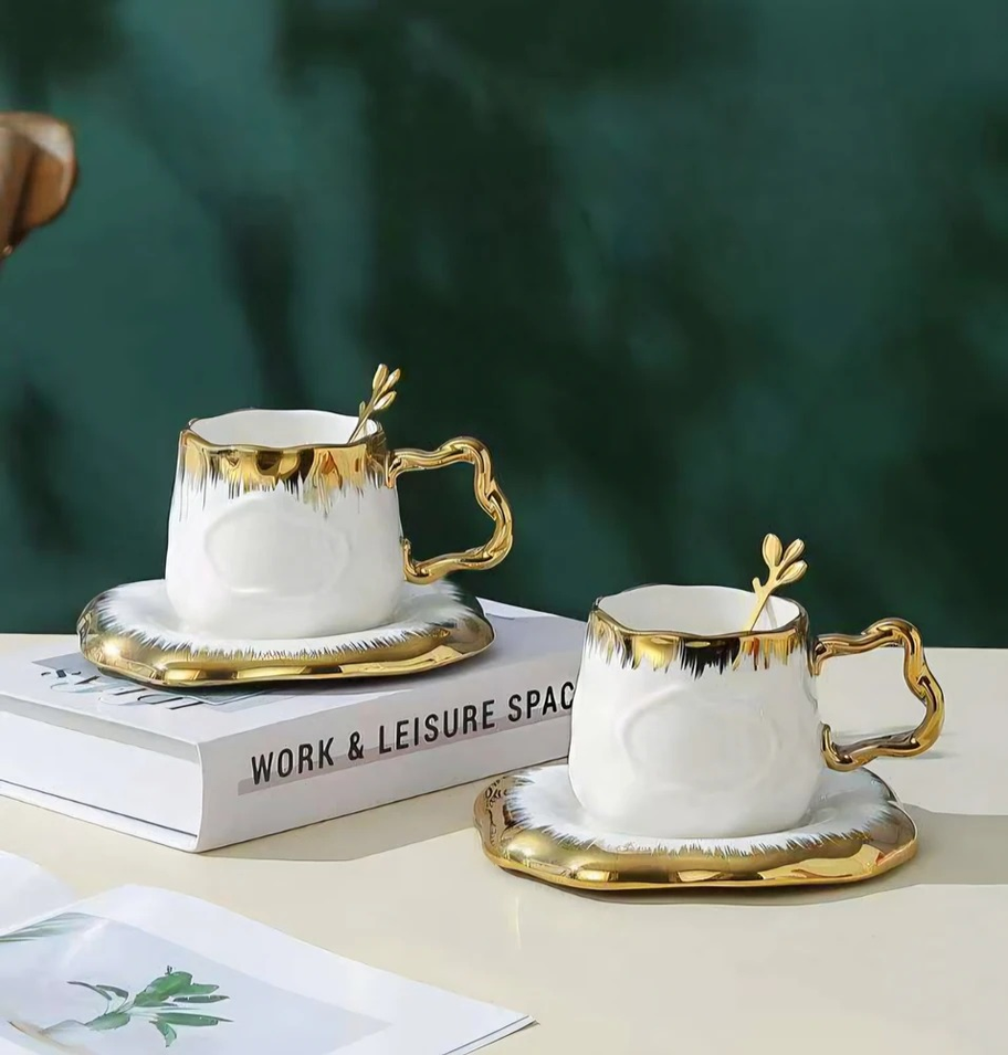 TAZA CON PLATO CERAMICA BLANCA CON DORADA