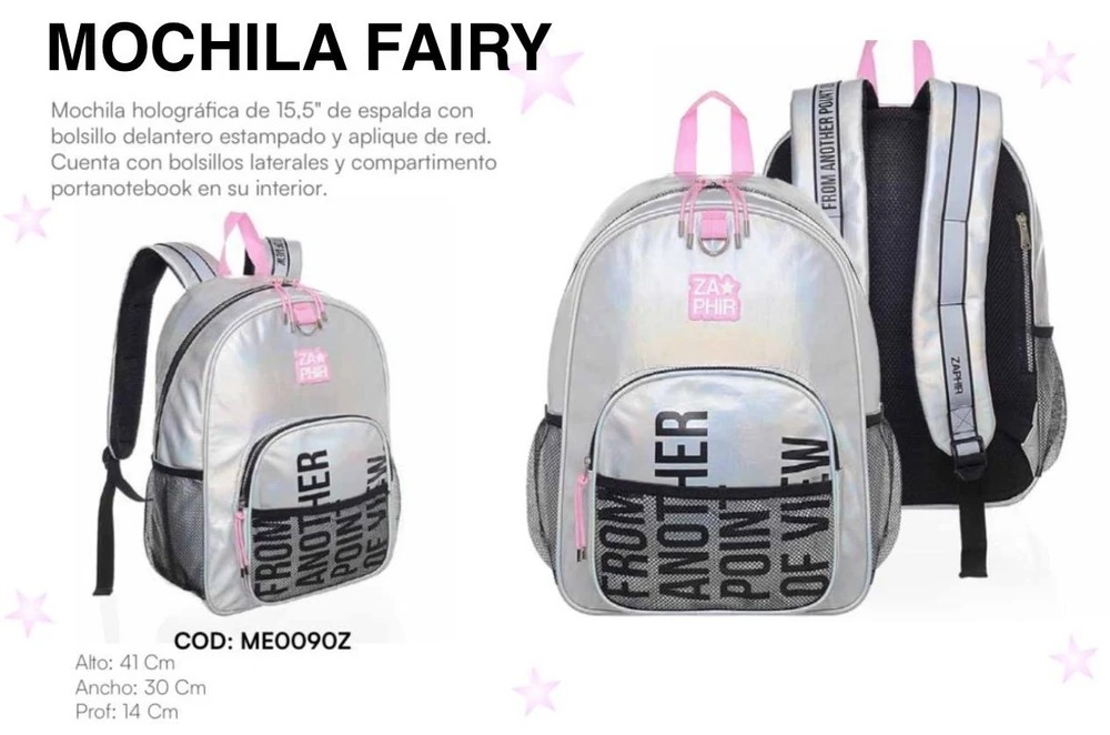 Mochila holográfica de 15.5pulgadas de espalda con bolsillo delantero estampado y aplique de red.