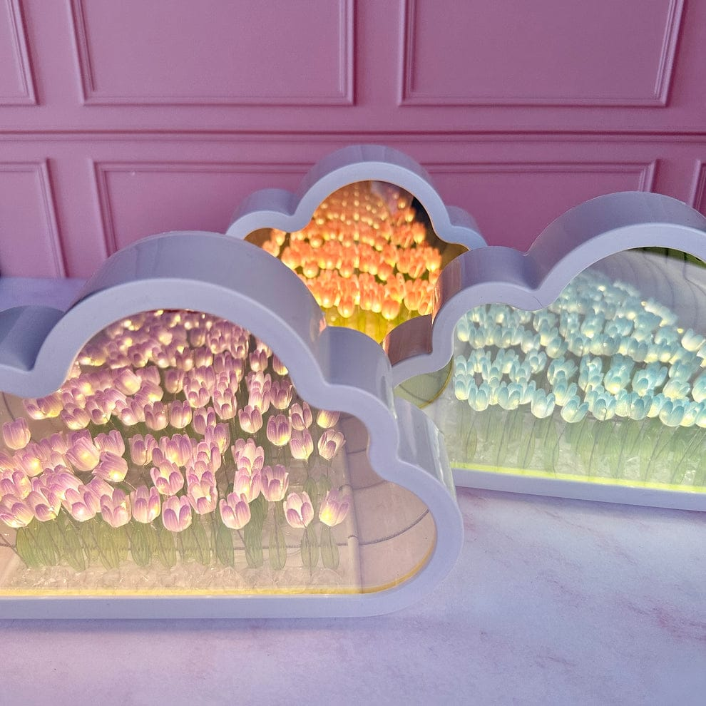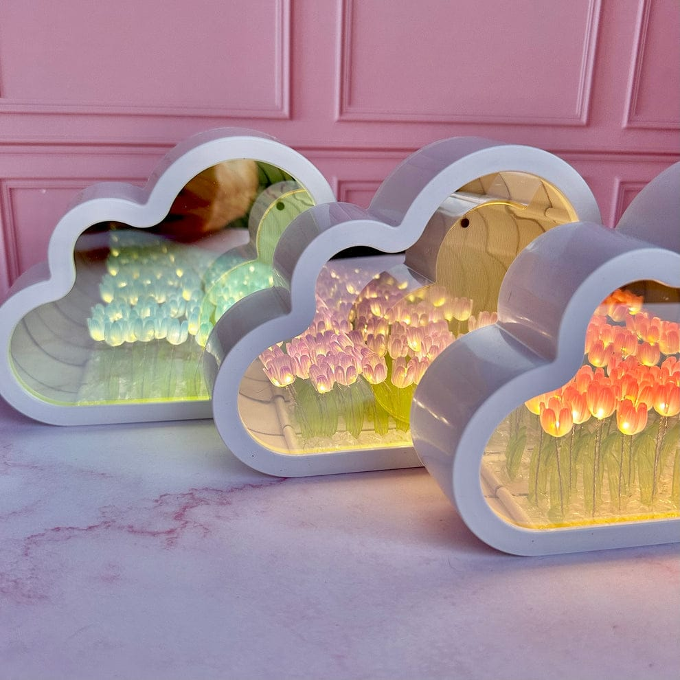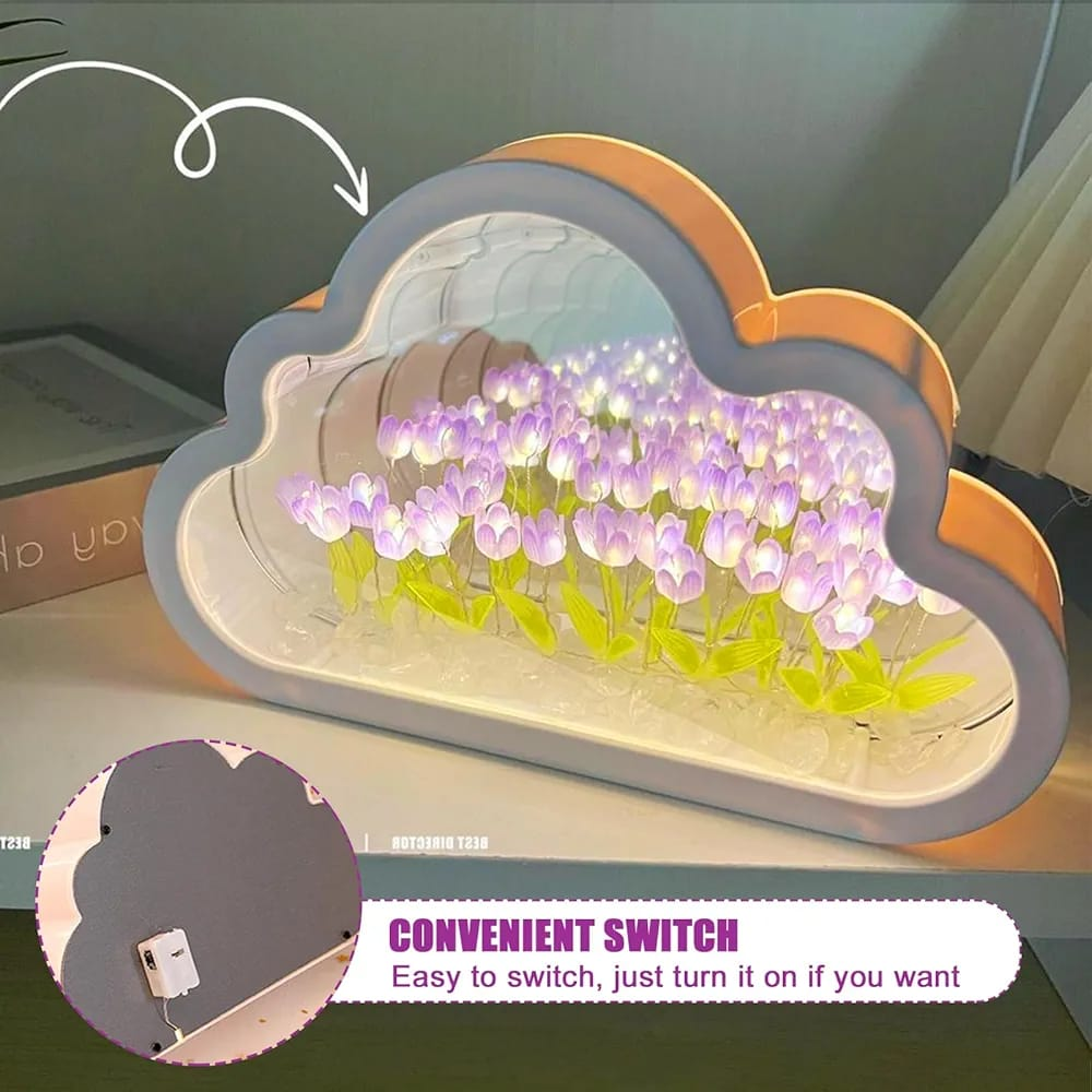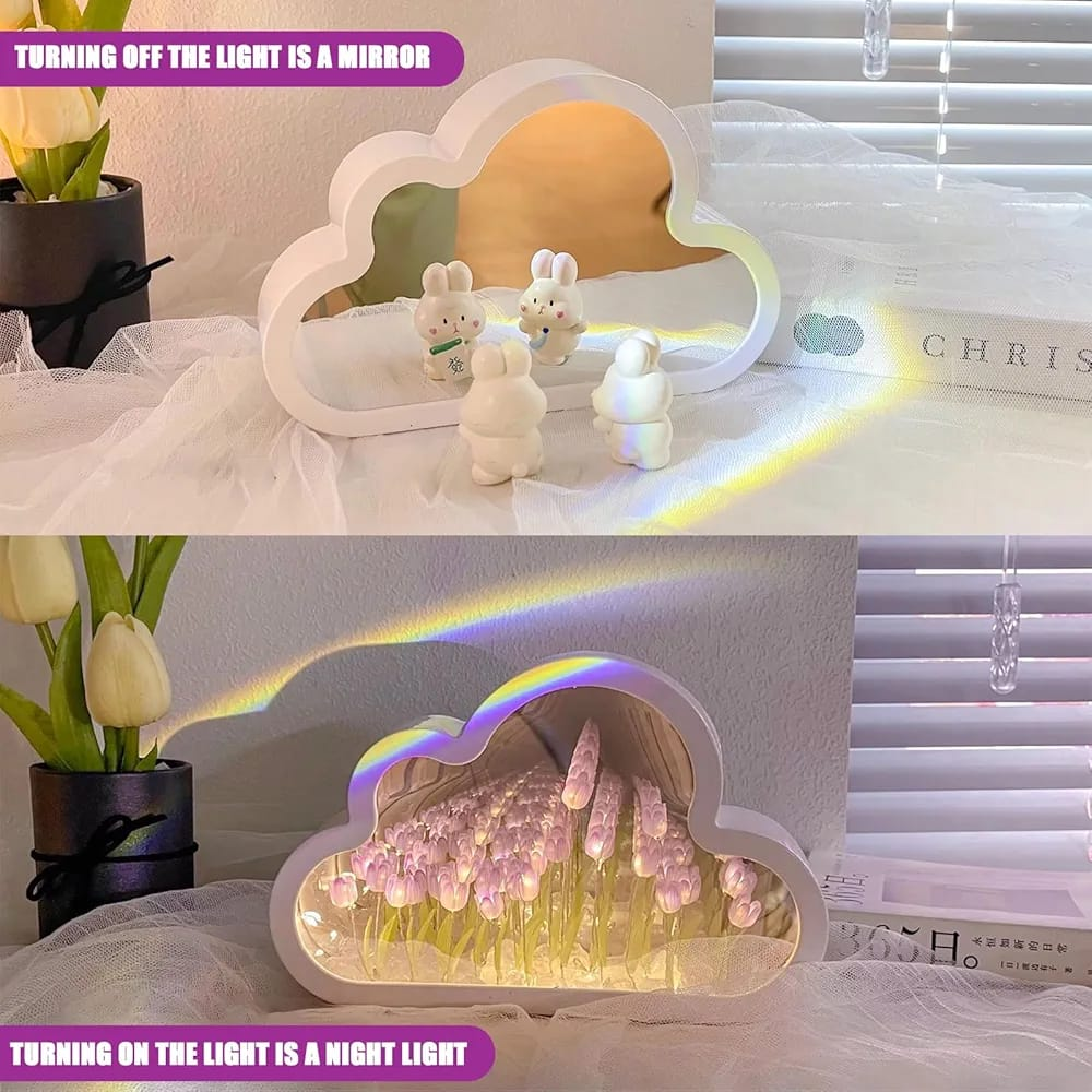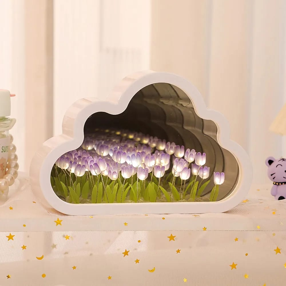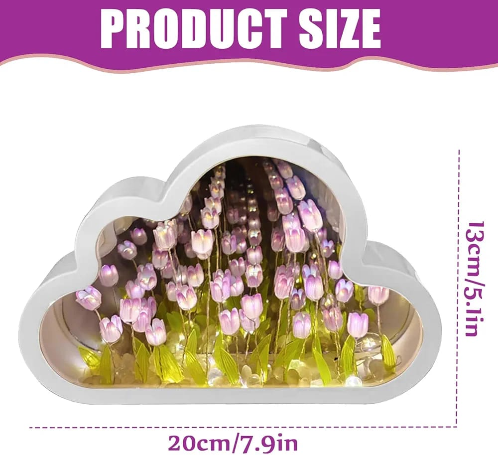 Esta es una Lámpara de Noche de Tulipanes con diseño de espejo infinito en forma de nube. Es un elemento decorativo versátil que funciona como espejo cuando está apagado y crea una ilusión de profundidad con flores iluminadas al encenderse. Resumen del producto Se trata de una pieza que combina estética y funcionalidad, diseñada para crear ambientes cálidos y relajantes. Información esencial Diseño: Forma de nube con efecto de "tulipanes infinitos" y luz LED. Dimensiones: 12 cm de alto por 20 cm de ancho. Alimentación: Funciona con un voltaje de 5V y se conecta mediante puerto USB. Materiales: Pantalla y estructura de espejo en color rosa. Eficiencia: Cuenta con una clasificación energética A+. Uso: Ideal para mesas de noche, habitaciones infantiles o como objeto decorativo en salas de estar.