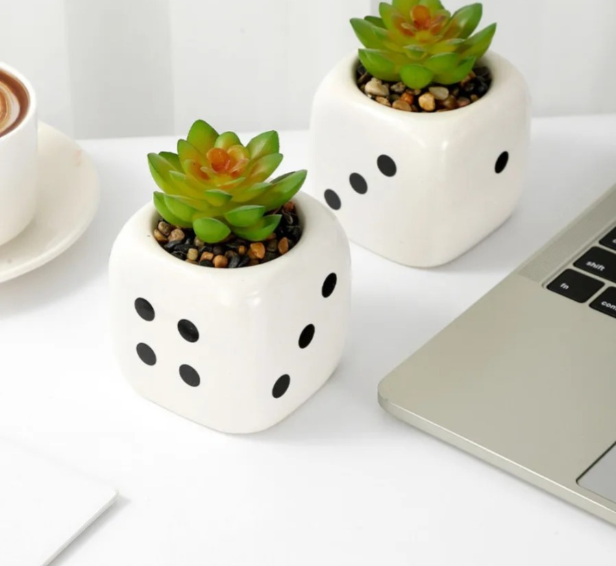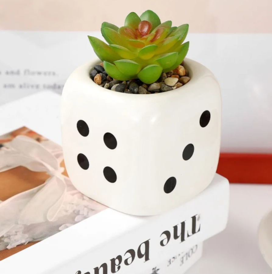 Maceta de cerámica con diseño de dado blanco y suculenta artificial incluida. Ideal para sumar un detalle moderno y divertido a cualquier espacio.