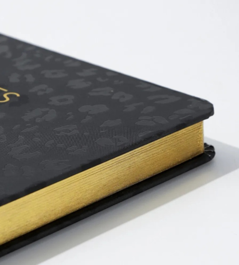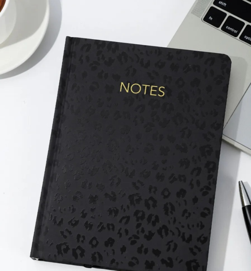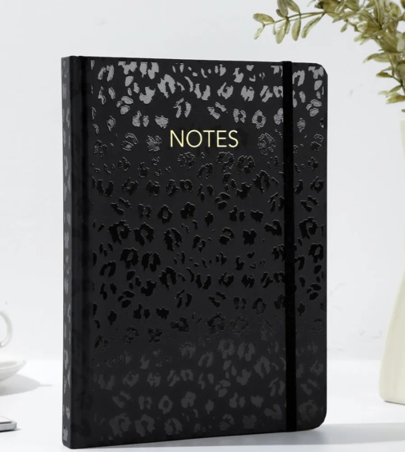 Cuaderno tapa dura con 120 hojas, ideal para tomar notas, planificación y uso diario. Cuenta con encuadernación cosida y banda elástica de cierre, que mantiene el cuaderno protegido y ordenado. Su cubierta con estampado animal print le aporta un estilo elegante. El interior presenta hojas punteadas, perfectas para escritura y organización.
