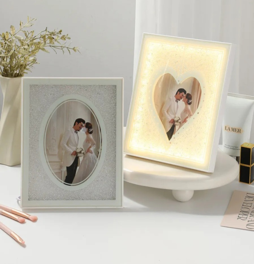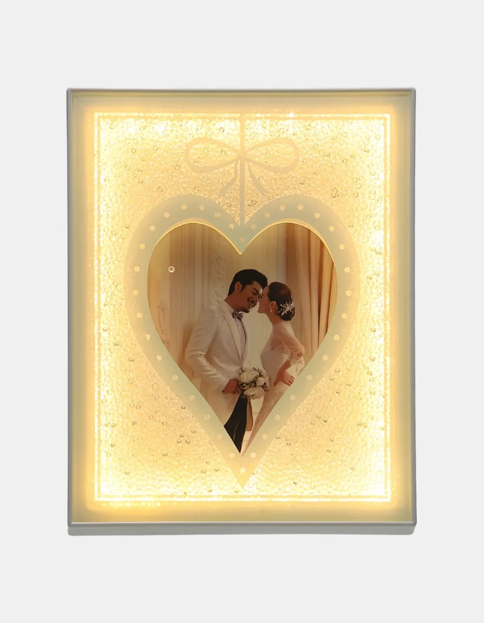 Resaltá tus recuerdos más especiales con este marco de fotos iluminado con luz LED integrada. Su diseño elegante con ventana en forma de corazón o óvalo y acabado brillante con detalles de brillo aporta un toque romántico y moderno a cualquier ambiente. Funciona con conexión USB, ideal para decorar dormitorios, livings o regalar en fechas especiales. La iluminación LED crea un efecto cálido y envolvente que realza tus fotos favoritas.