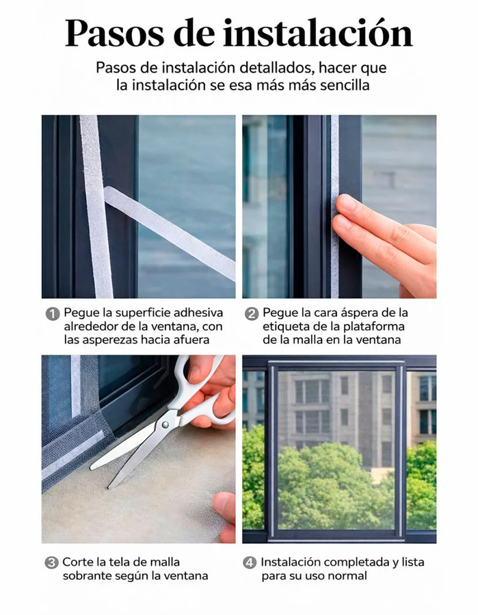 - Tamaño ajustable: se adapta a la mayoría de puertas/ventanas.