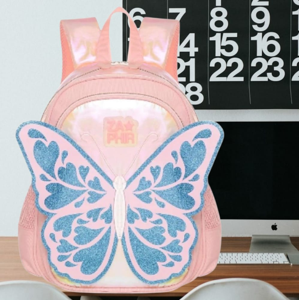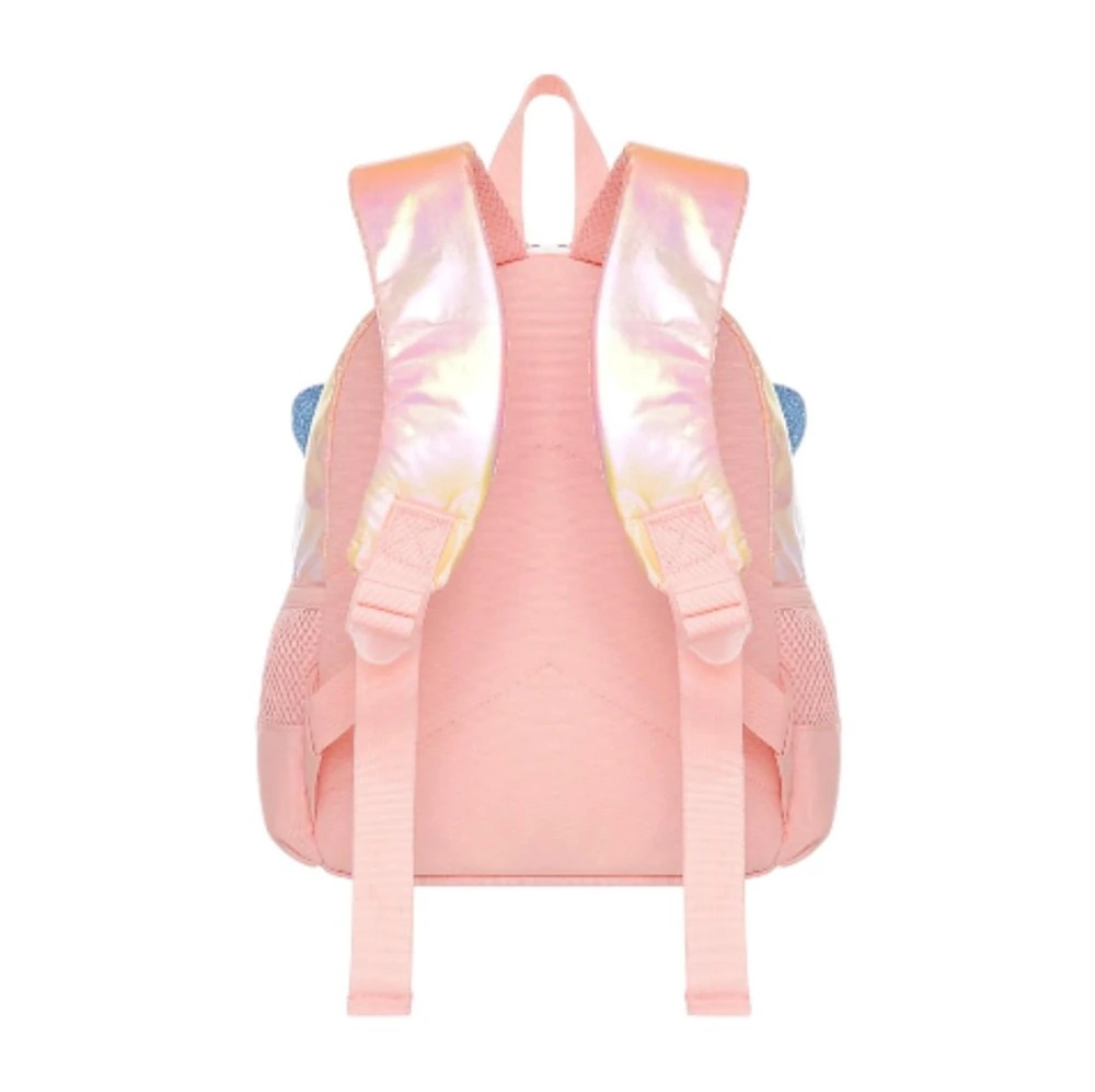 Mochila holográfica de 12" de espalda con aplique de mariposa. Cuenta con bolsillos laterales y doble compartimento superior