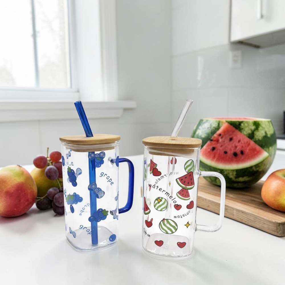 JARRO DE VIDRIO CON TAPA BAMBU + SORBETE ESTAMPADO
