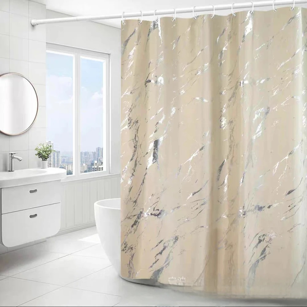 CORTINA BAÑO TELA TEFLON ANTIHONGO BEIGE CON PLATA