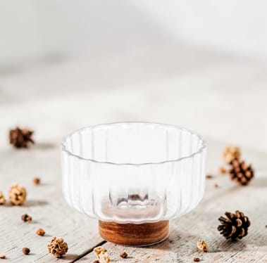 BOWL DE VIDRIO 9.5CM X 14CM CON BASE ACACIA