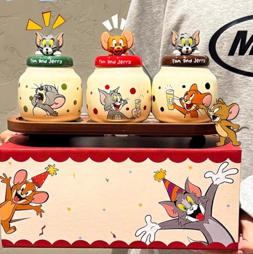 SET DE 3 ESPECIEROS CON TAPA CERAMICA TOM Y JERRY + BANDEJA
