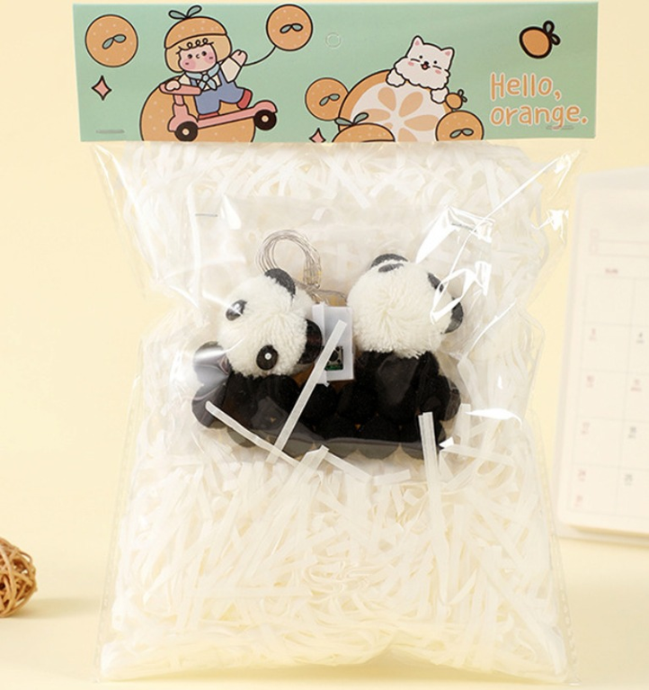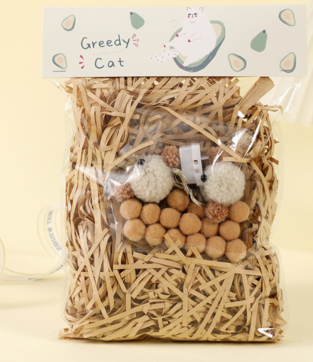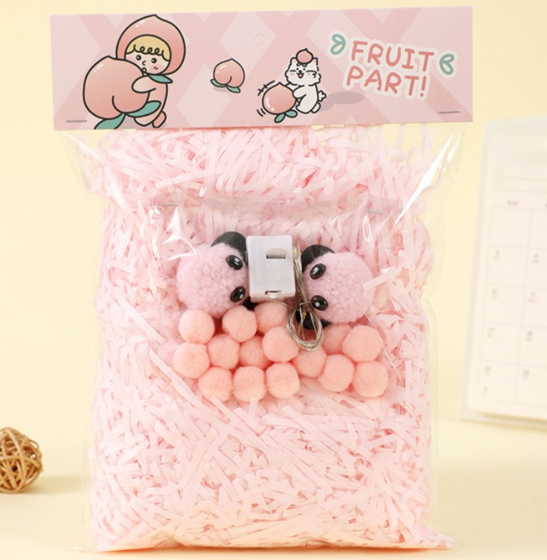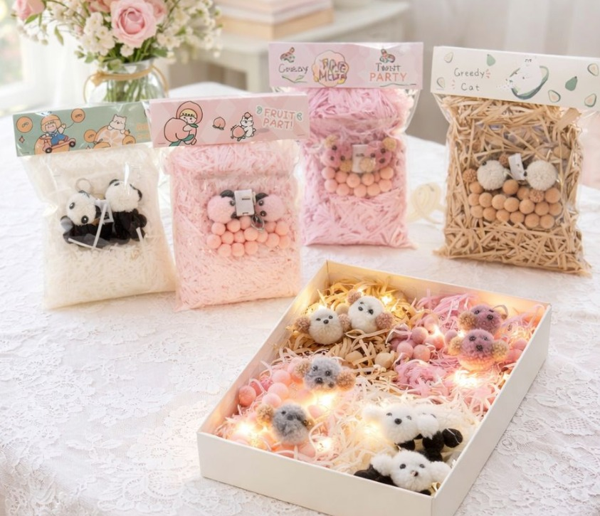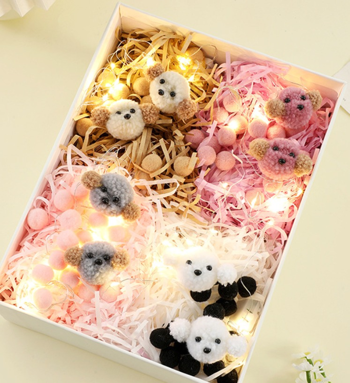 PAQUETE DE VIRUTAS DE PAPEL CON PELUCHITOS Y POMPONES+ LUCES