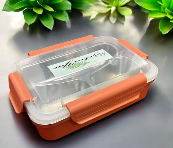 Vianda rectangular , interior con 3 compartimientos, de acero inoxidable, Tapa con trabas. Medias: 21.5 x 15 x 6