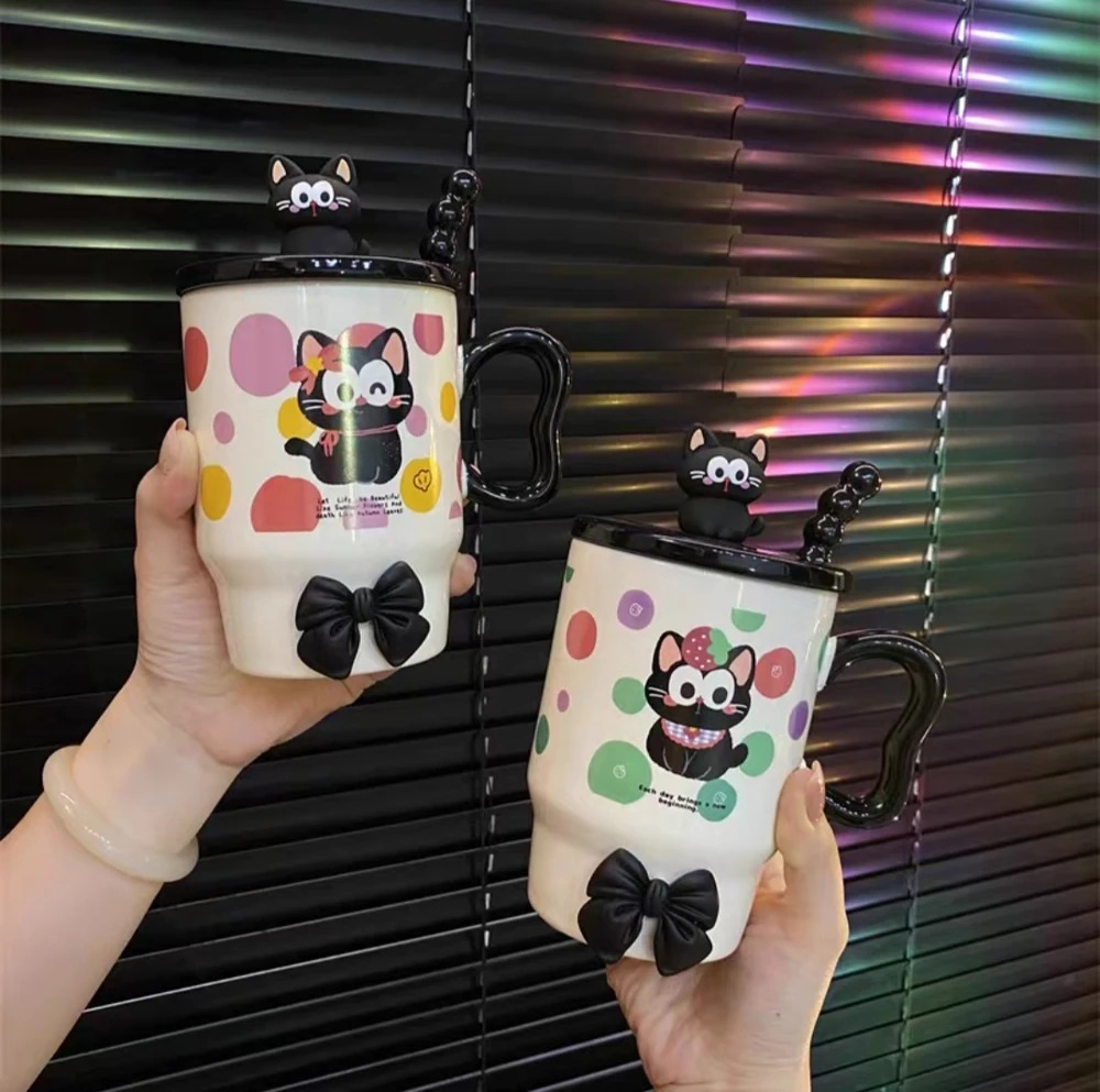 TAZA CERAMICA GATO CON LUNARES CON TAPA +CUCHARA