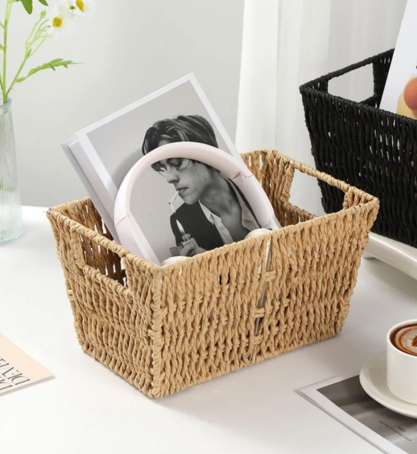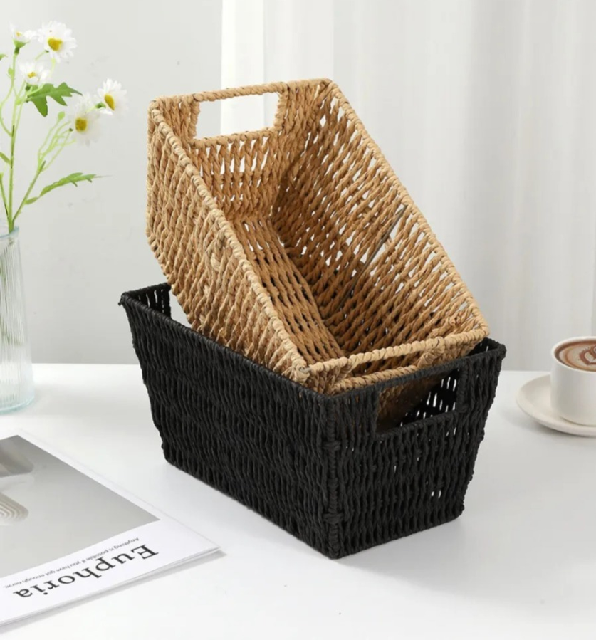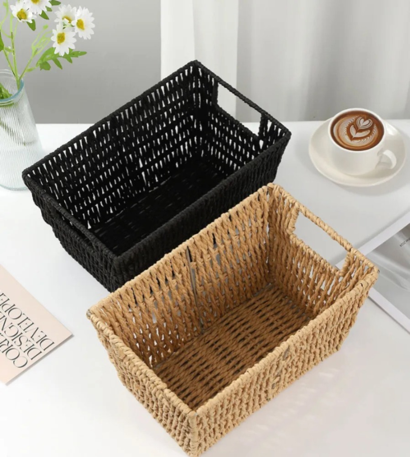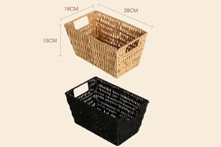 Organizador con estructura de hierro recubierto con cuerda tejida, resistente y decorativa. Ideal para baño, cocina, dormitorio o escritorio.