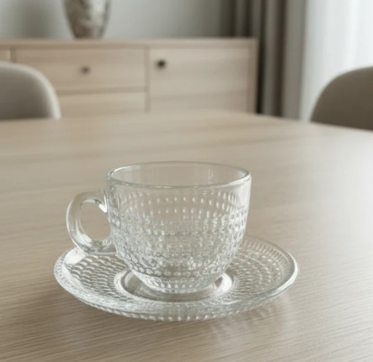 Set x 6 tazas de vidrio con plato.Color: tornasoladoMedidas: taza 6.3x5.5cm plato 11cm