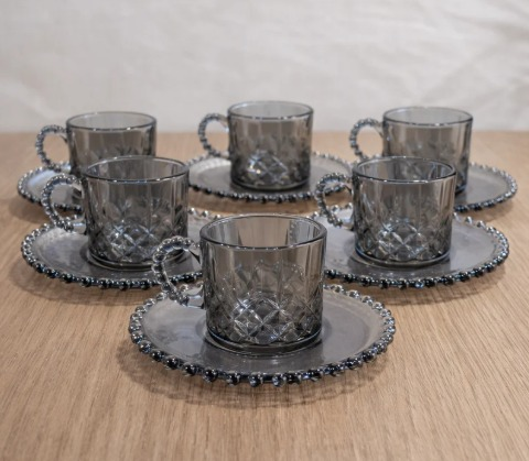 SET X 6 TAZAS + PLATOS STYLE GREY DE VIDRIO