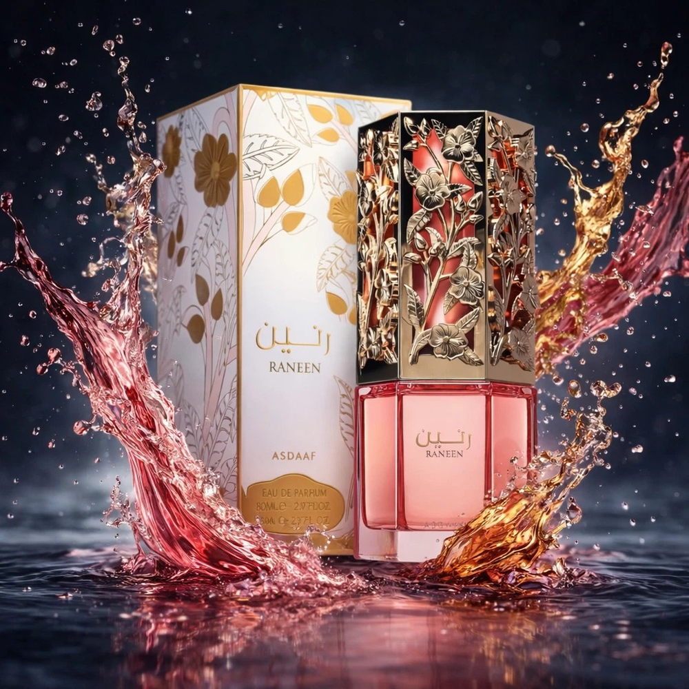 Raneen de Asdaaf es una fragancia de la familia olfativa Floral Frutal Gourmand para Mujeres. Esta fragrancia es nueva. Raneen se lanzó en 2025. Las Notas de Salida son pitahaya, pera y mandarina; las Notas de Corazón son flor de azahar del naranjo, jazmín y fresia; las Notas de Fondo son almizcle, vainilla, ámbar y haba tonka.