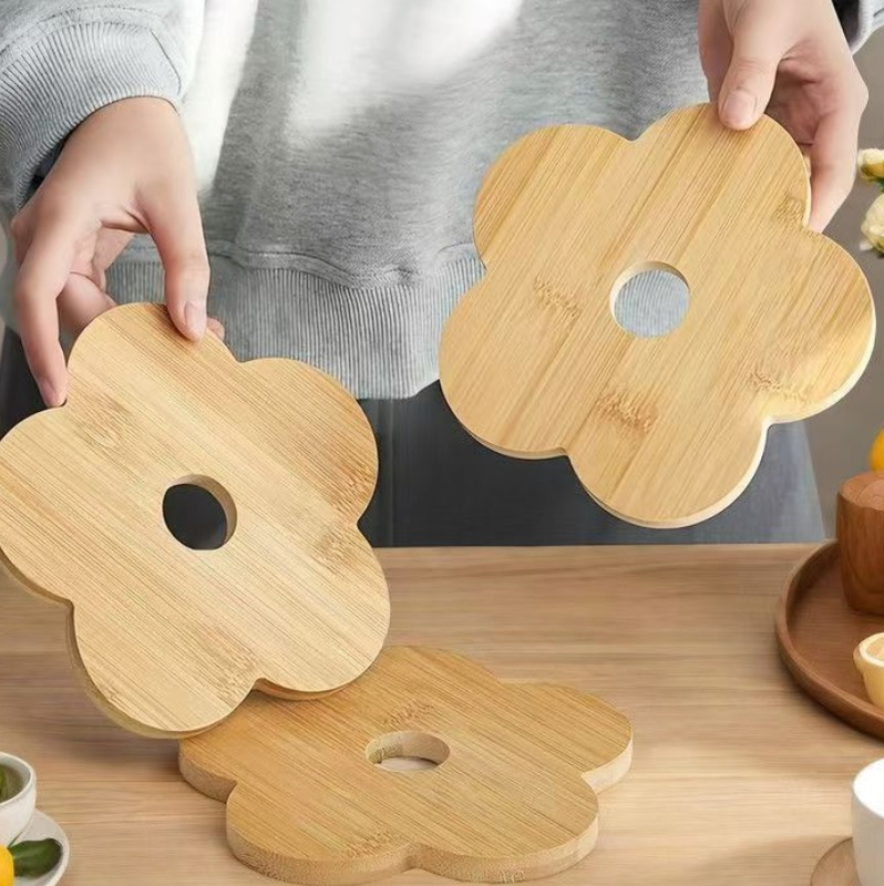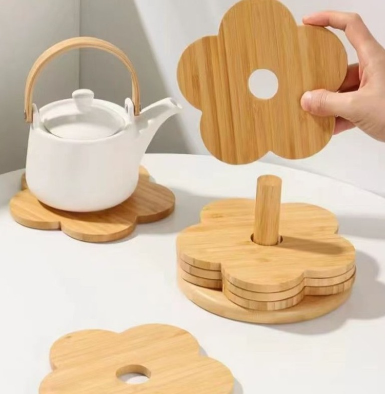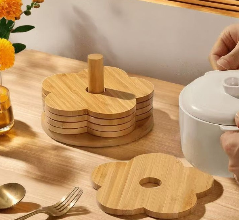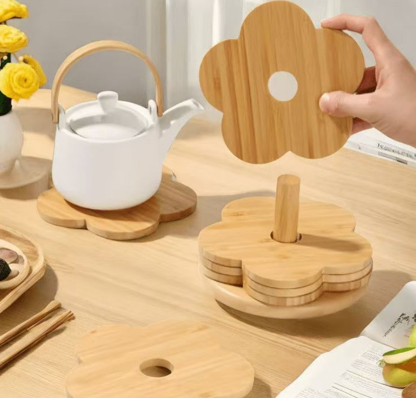 PORTAVASO MADERA FLOR X 4+ SOPORTE GRANDE 15 X 15CM