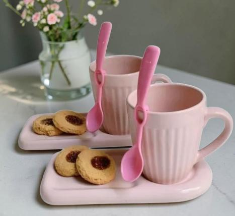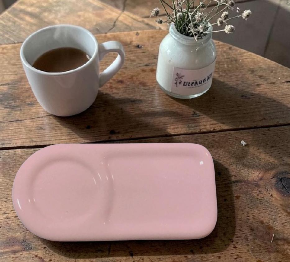 BANDEJA PLATO CERAMICA CON APOYA TAZA ROSA